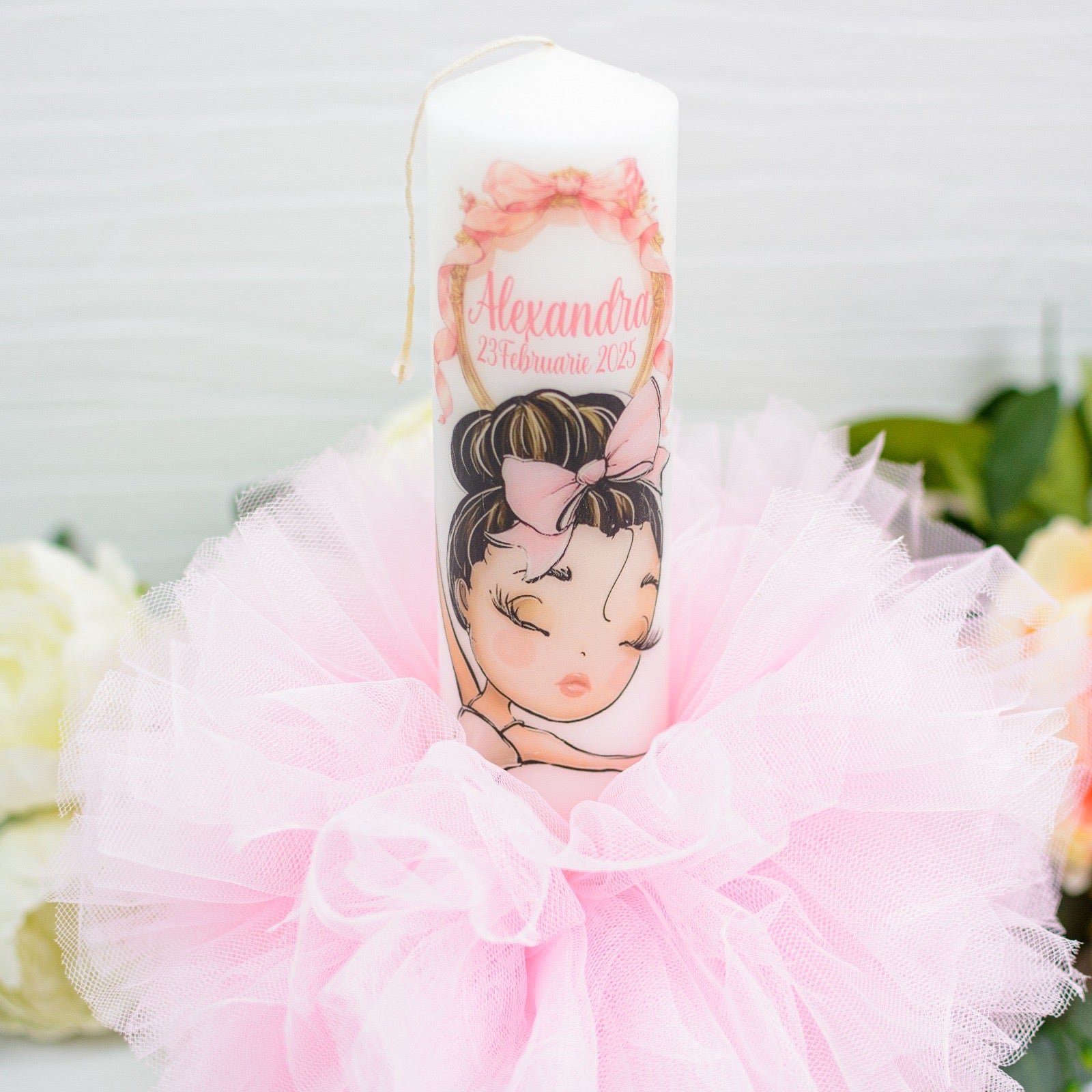 • Lumânare de botez personalizată, decorată cu tull, gheme sau mascotă tematică, imprimată cu numele copilului și data evenimentului.