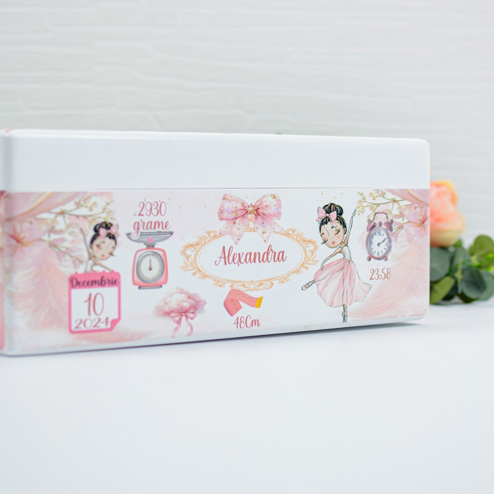 • Cutie din lemn personalizată, realizată manual, decorată cu produse nontoxice, pe bază de apă, și personalizată cu numele copilului, data și personajul dorit.