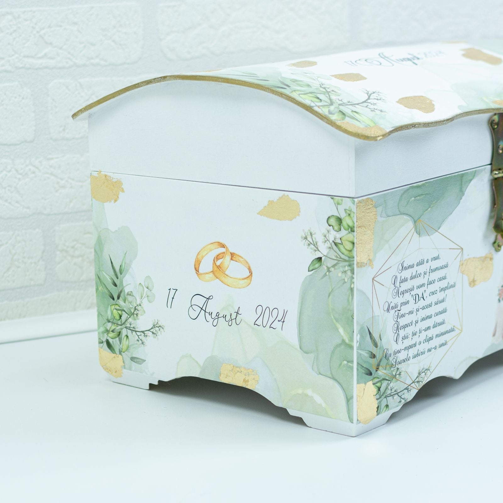 - Data Nuntii: Adăugați data specială pe cufăr pentru a marca începutul călătoriei voastre împreună.