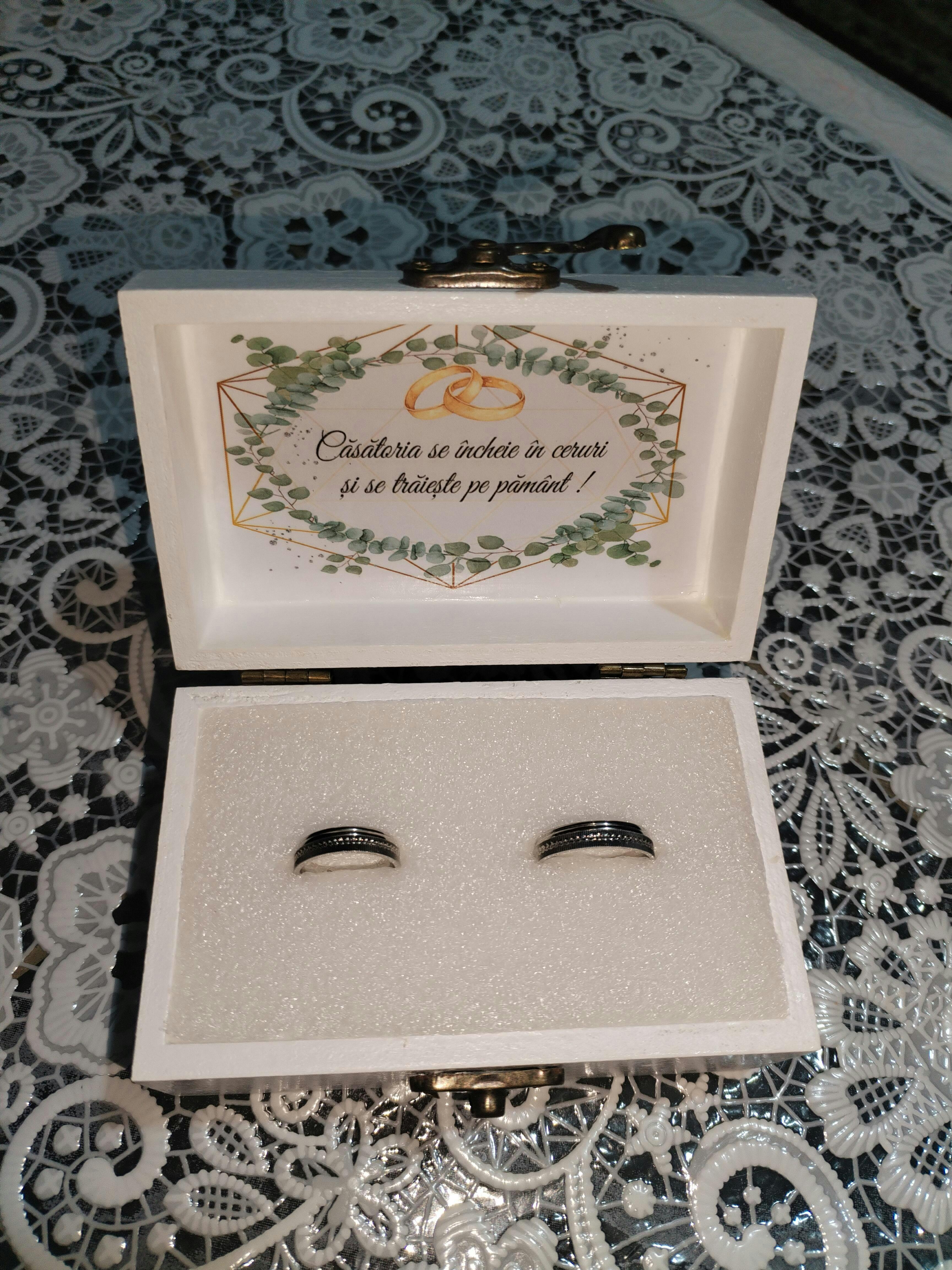 În ziua nuntii voastre, niciun alt detaliu nu este mai semnificativ și emoționant decât momentul în care schimbați verighetele. Aceste inele simbolizează eternitatea iubirii voastre, iar păstrarea lor sigură și elegantă este esențială. Iată de ce vă prezentăm Cutie verighete cu frunze de eucalipt, un produs care adaugă o notă specială și personală la un moment deja plin de semnificație.