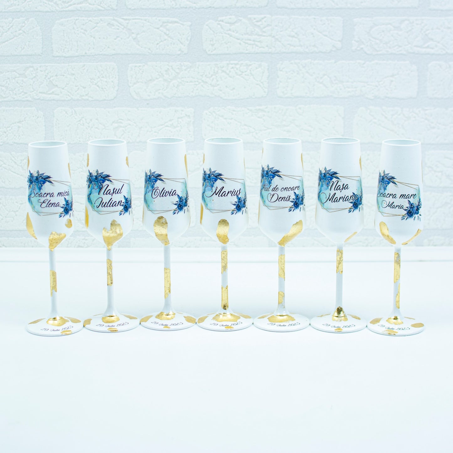 Unul dintre momentele cele mai memorabile ale nunții este atunci când mirii și nașii întâmpină invitații la restaurant cu aceste pahare personalizate strălucitoare. Gestul de a ridica paharele pentru toast nu numai că marchează începutul festivităților, dar și arată invitaților că evenimentul este unul special și cu adevărat deosebit. Fiecare pahar cu foită de aur strălucitoare adaugă o notă de eleganță și lux, transformând întâmpinarea într-o experiență memorabilă pentru toți cei prezenți.