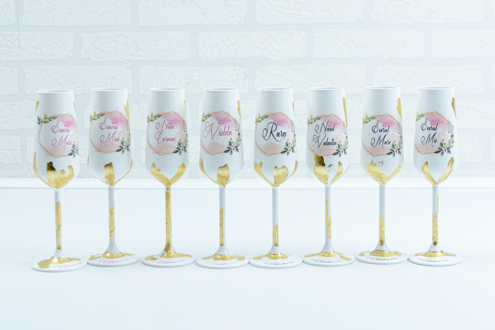 Unul dintre momentele cele mai memorabile ale nunții este atunci când mirii și nașii întâmpină invitații la restaurant cu aceste pahare personalizate strălucitoare. Gestul de a ridica paharele pentru toast nu numai că marchează începutul festivităților, dar și arată invitaților că evenimentul este unul special și cu adevărat deosebit. Fiecare pahar cu foită de aur strălucitoare adaugă o notă de eleganță și lux, transformând întâmpinarea într-o experiență memorabilă pentru toți cei prezenți.