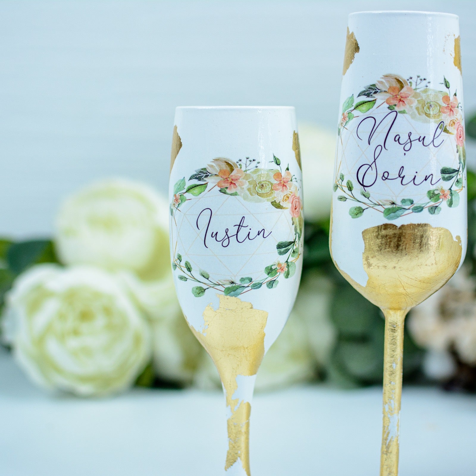 La RoHandWork, înțelegem că fiecare cuplu dorește să-și aducă propria notă de eleganță și stil în ziua nunții lor. De aceea, oferim pahare de șampanie personalizate cu folie de aur, care adaugă un element de lux în evenimentul dumneavoastră special. Personalizarea Set pahare nunta personalizate cu Foita aurie -Rohandwork se realizează cu precizie și atenție la detalii: