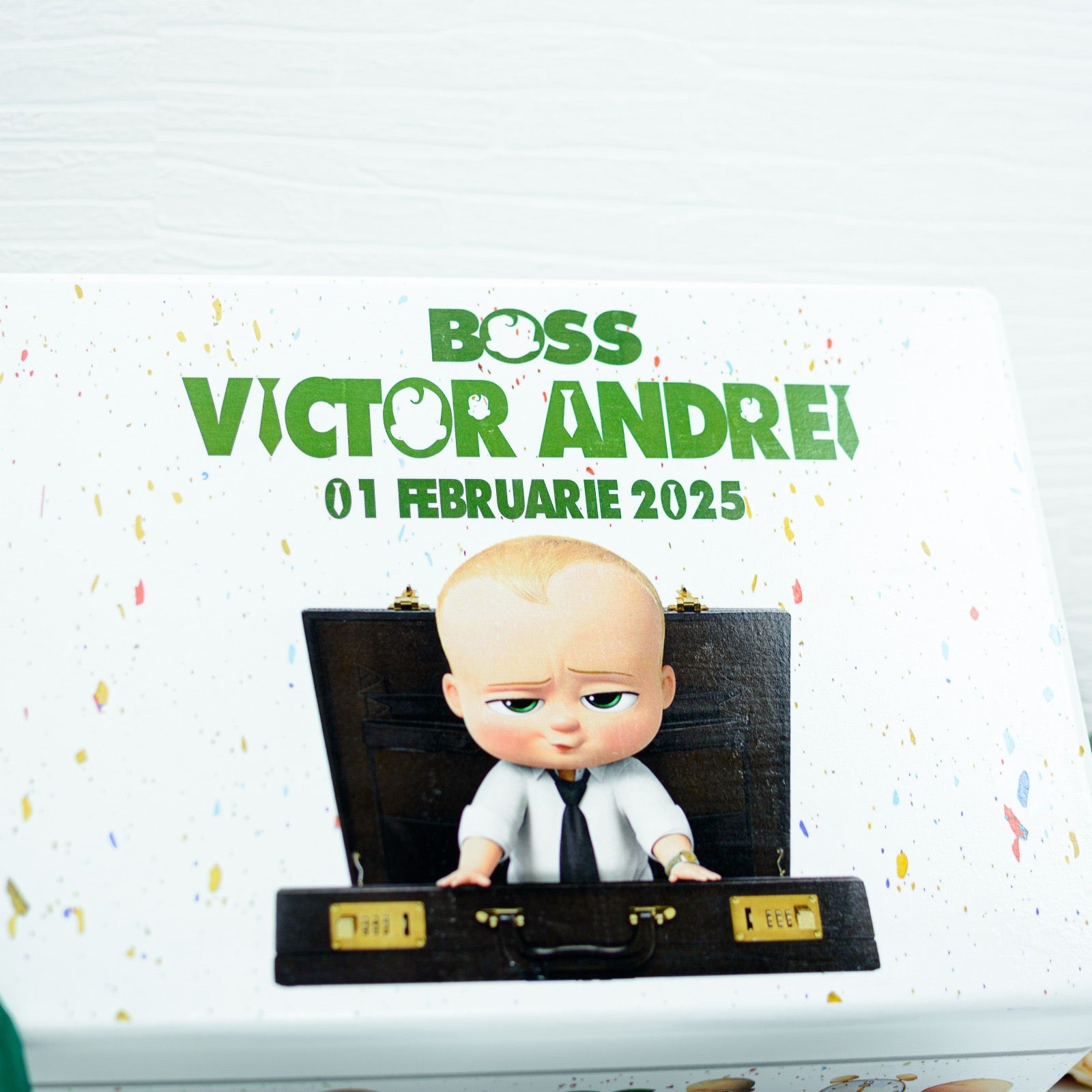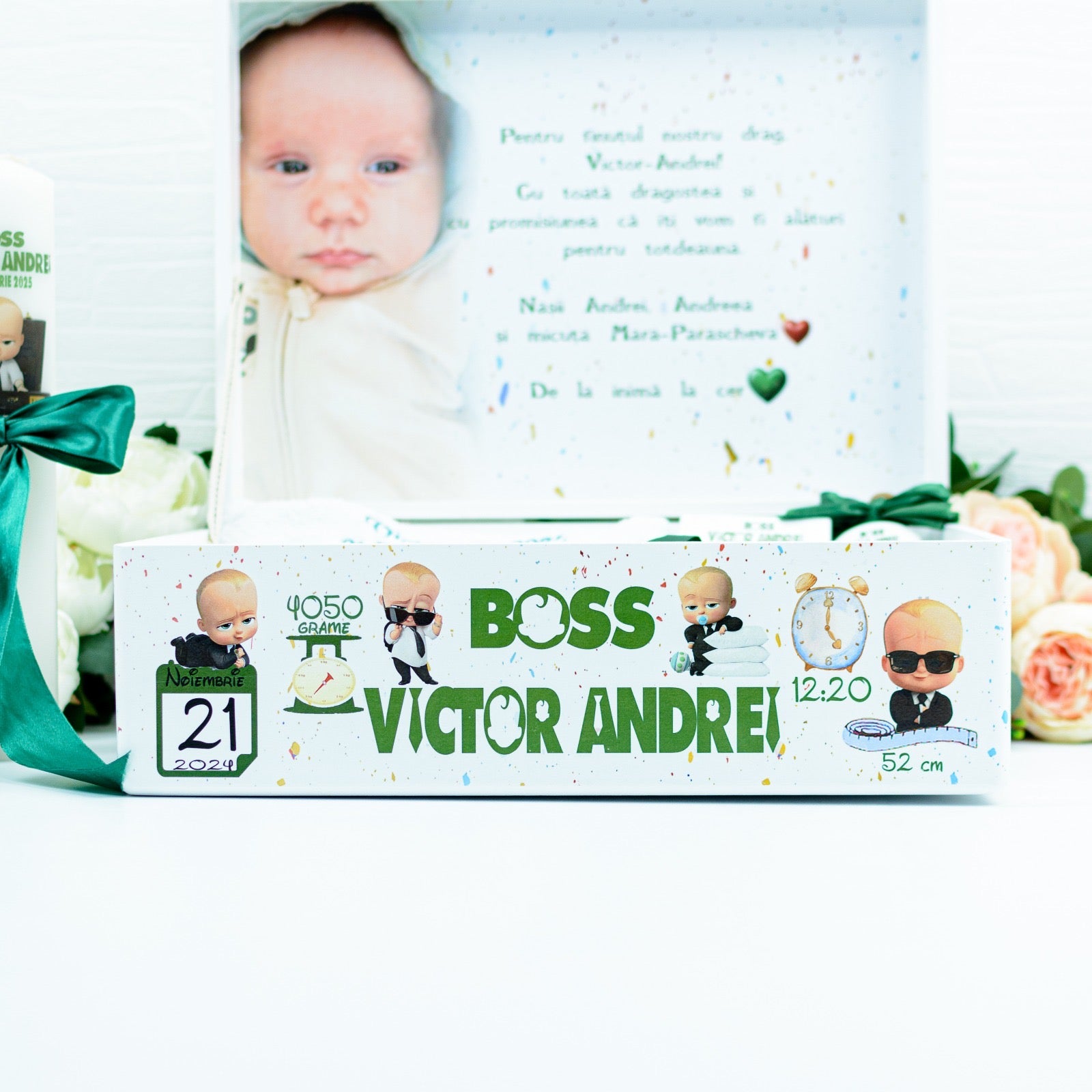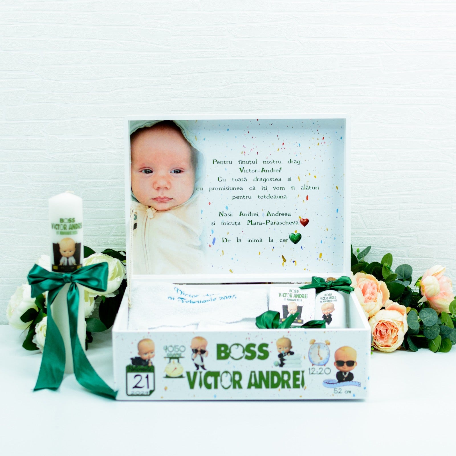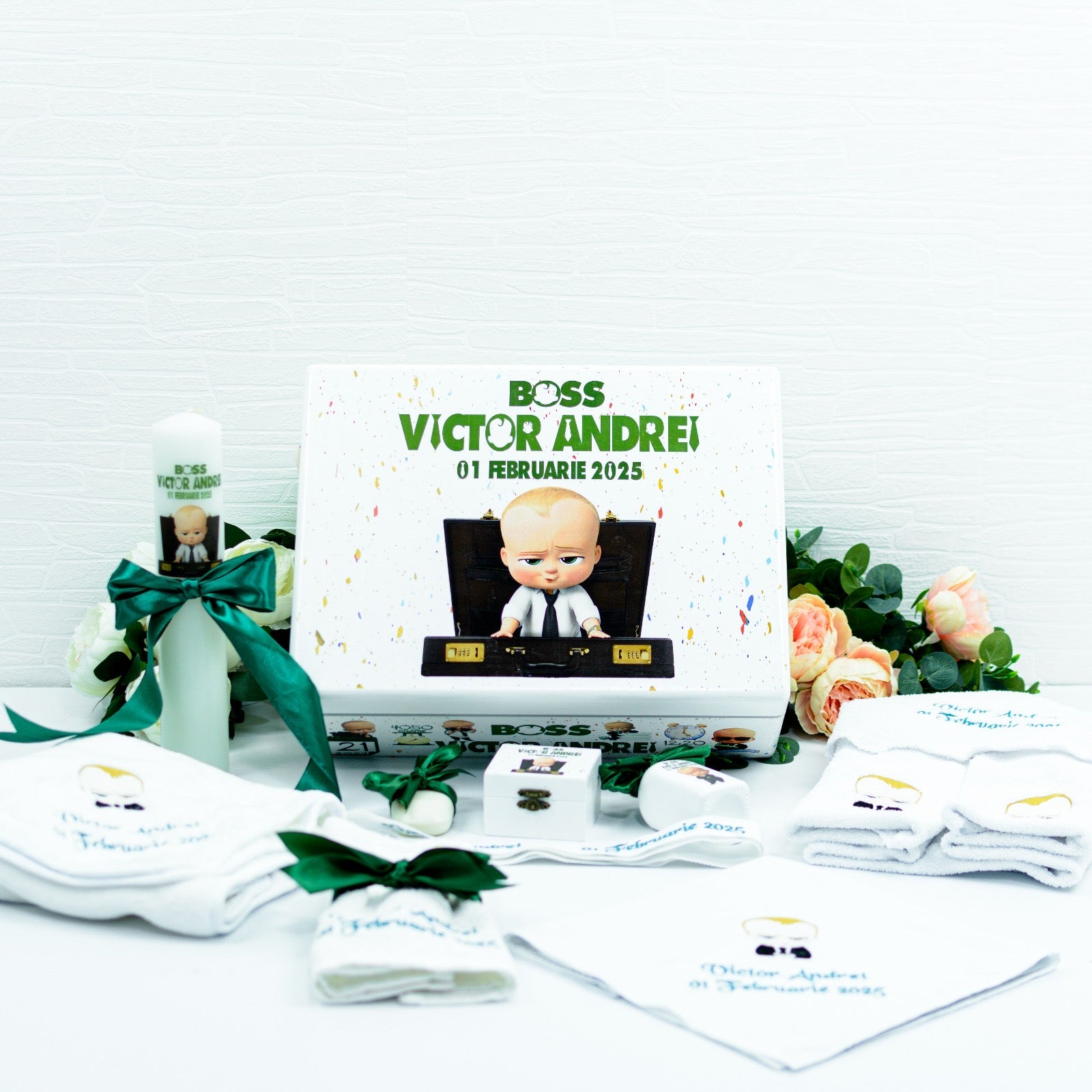 Comandă acum Setul Set trusou Baby Boss servieta verde pentru o experiență de neuitat la botezul copilului tău!