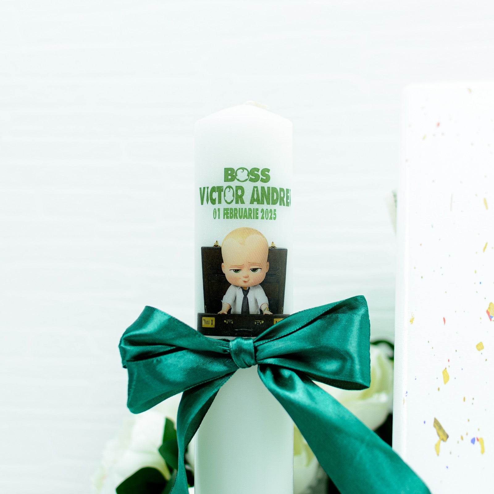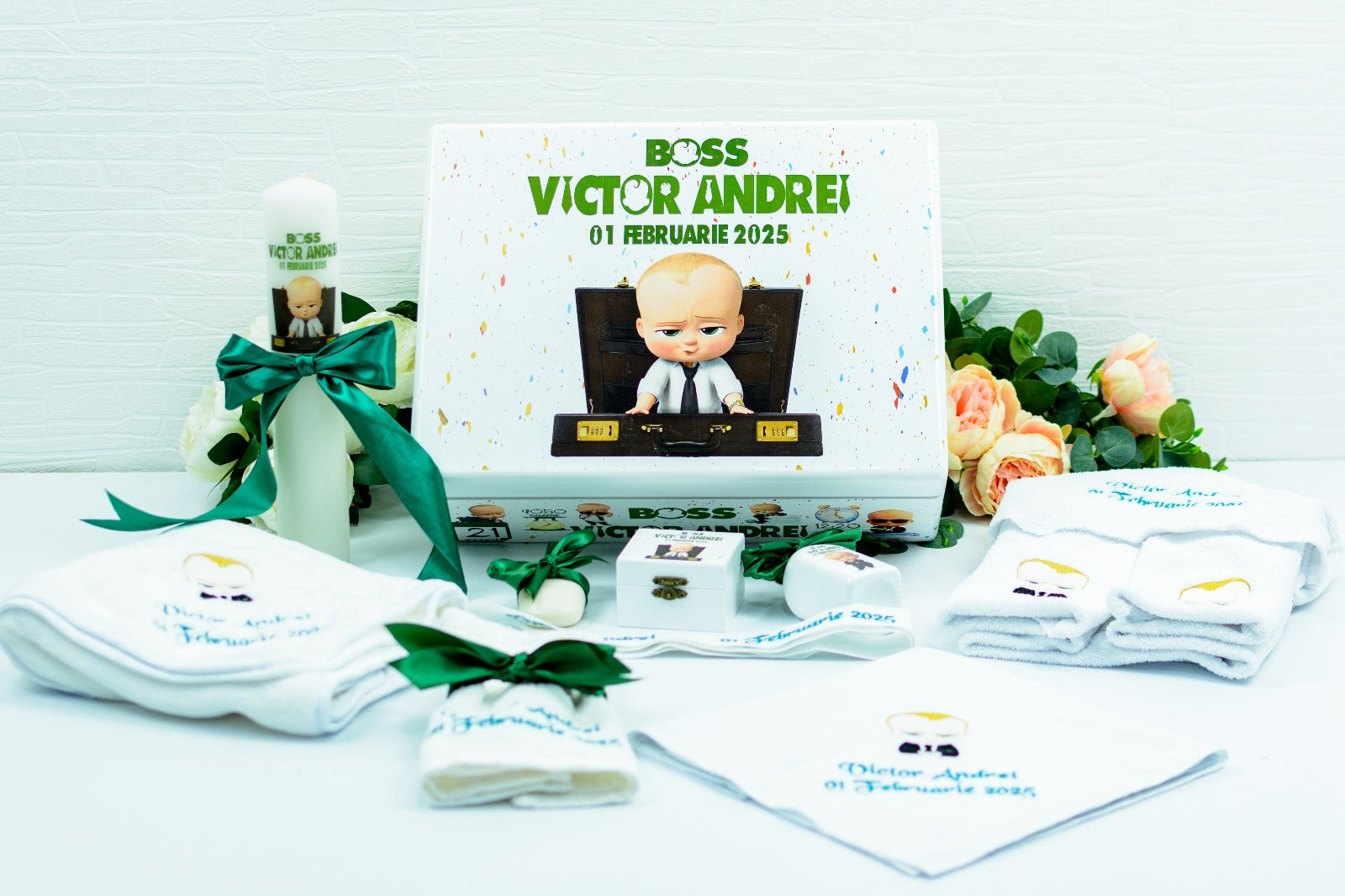 Setul Set trusou Baby Boss servieta verde este creat pentru a transforma ceremonia de botez într-un moment special. Produsele sunt personalizate cu broderii de înaltă calitate, care includ personajul preferat, numele copilului și data evenimentului, oferind unicitate și eleganță.