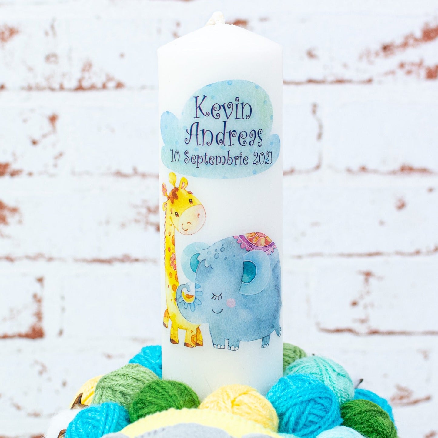 - Lumânare de botez personalizată, decorată cu tull, gheme sau mascotă tematică, imprimată cu numele copilului și data evenimentului.