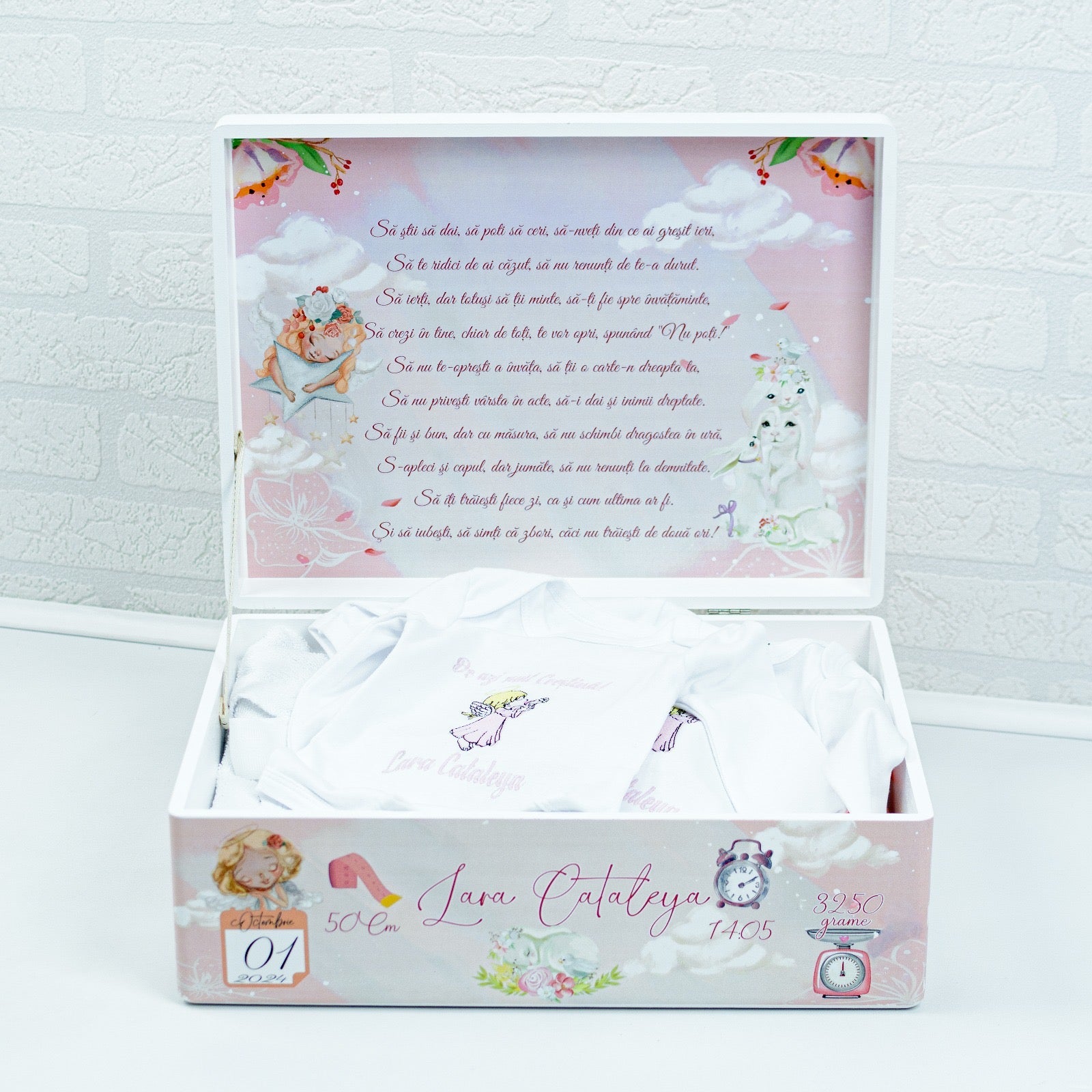 - Cutie din lemn personalizată, realizată manual, decorată cu produse nontoxice, pe bază de apă, și personalizată cu numele copilului, data și personajul dorit.