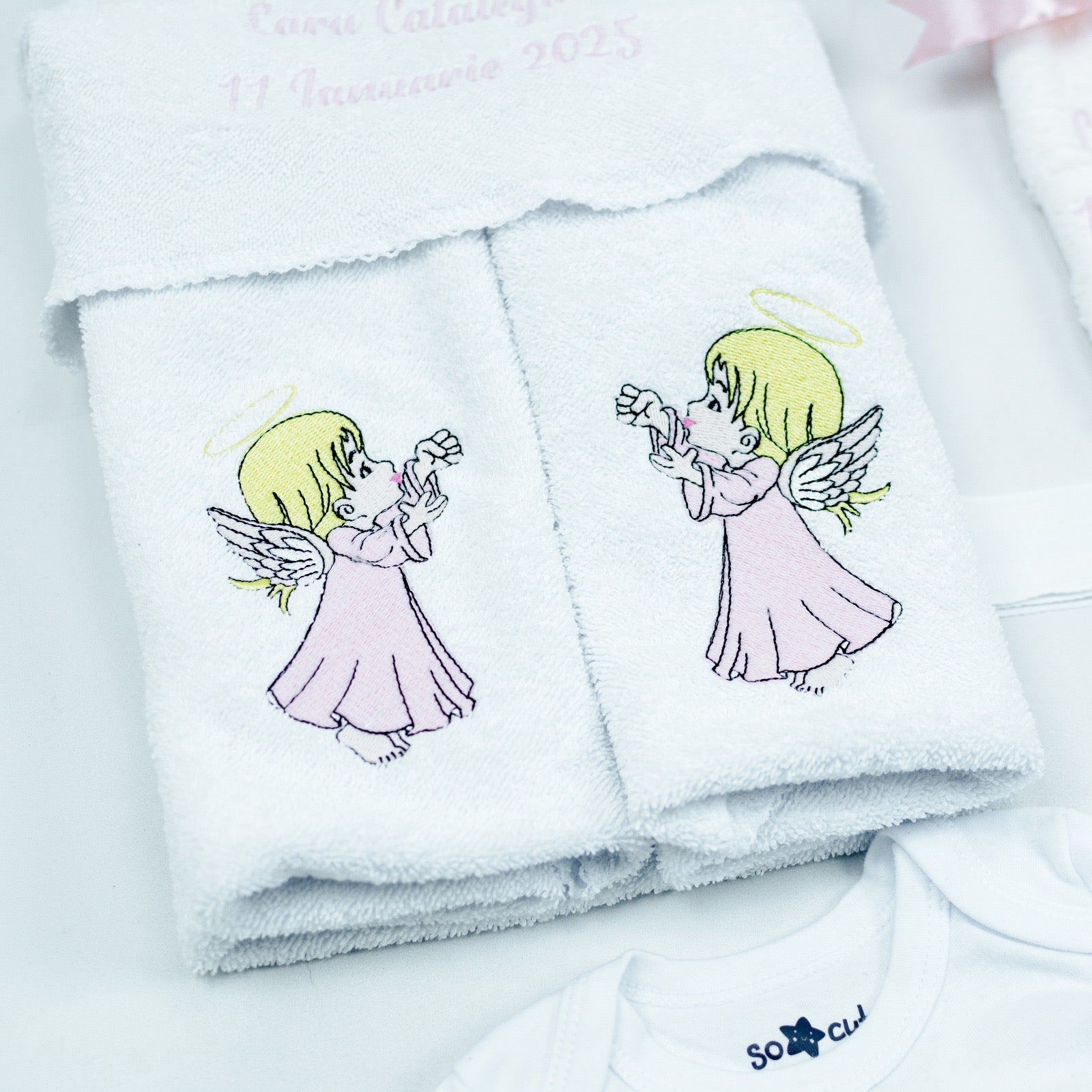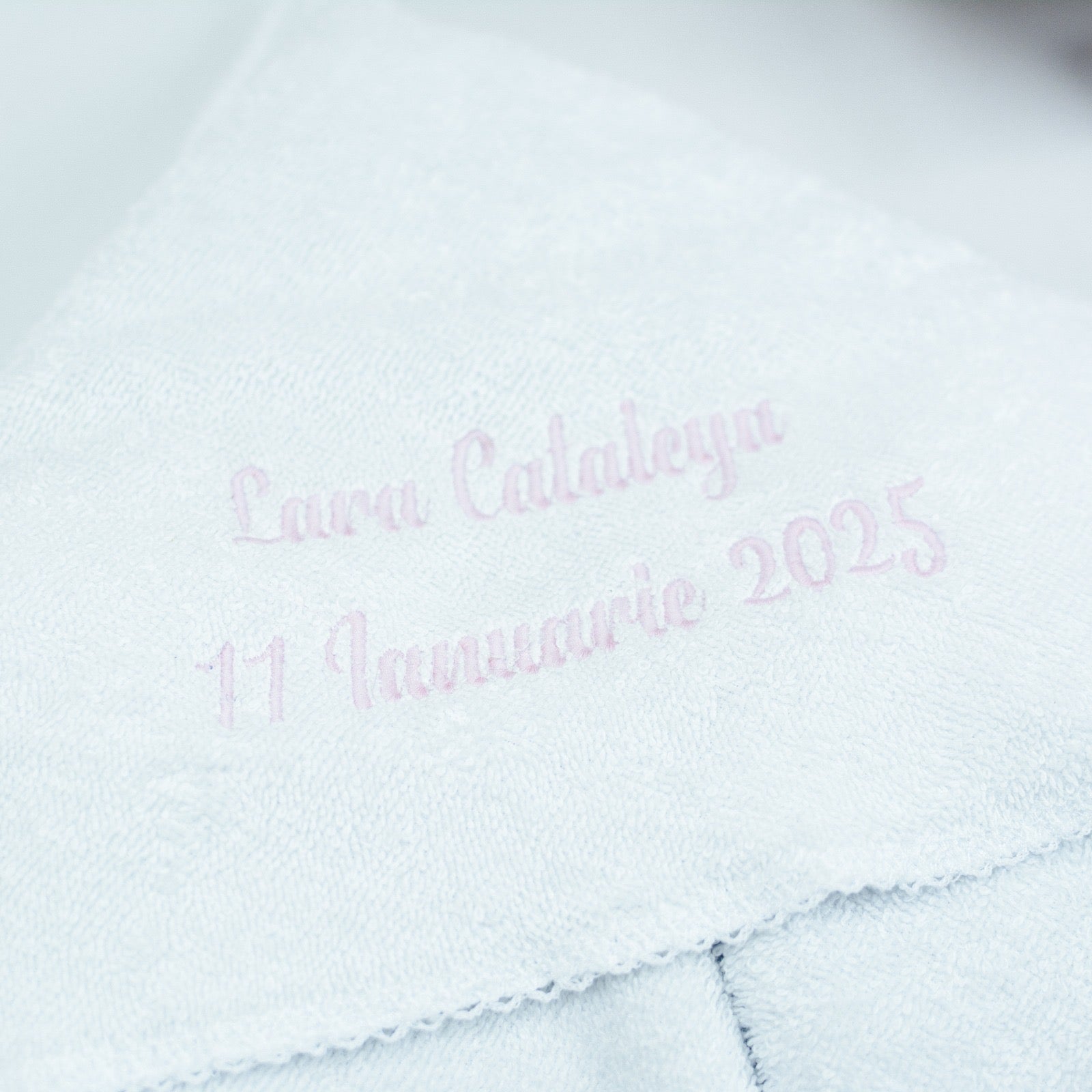 - Prosop cu glugă pentru bebeluș, din bumbac moale, brodat cu personaj, numele copilului și data evenimentului.