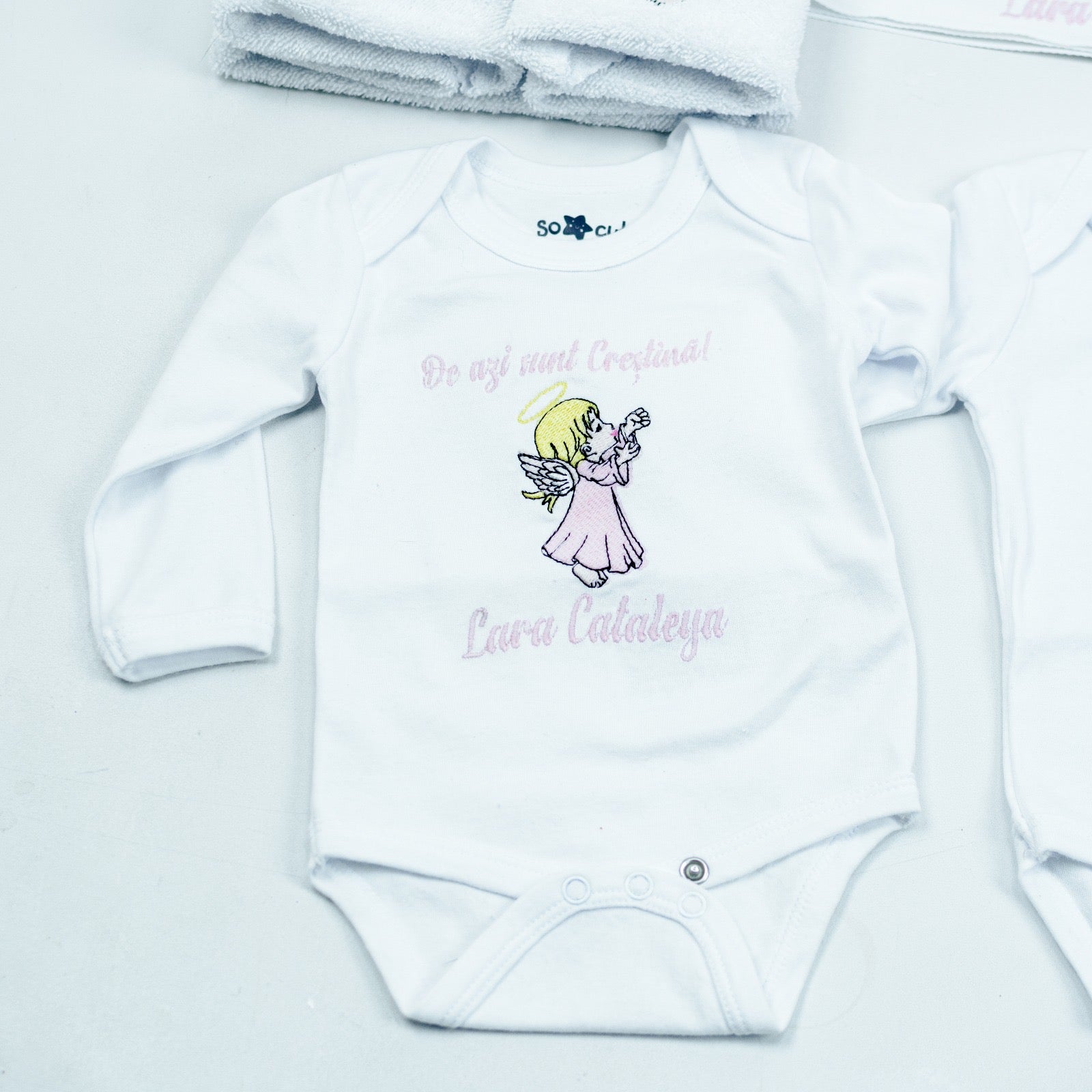 Trusou Ingeras delicat este creat pentru a transforma ceremonia de botez într-un moment special. Produsele sunt personalizate cu broderii de înaltă calitate, care includ personajul preferat, numele copilului și data evenimentului, oferind unicitate și eleganță.